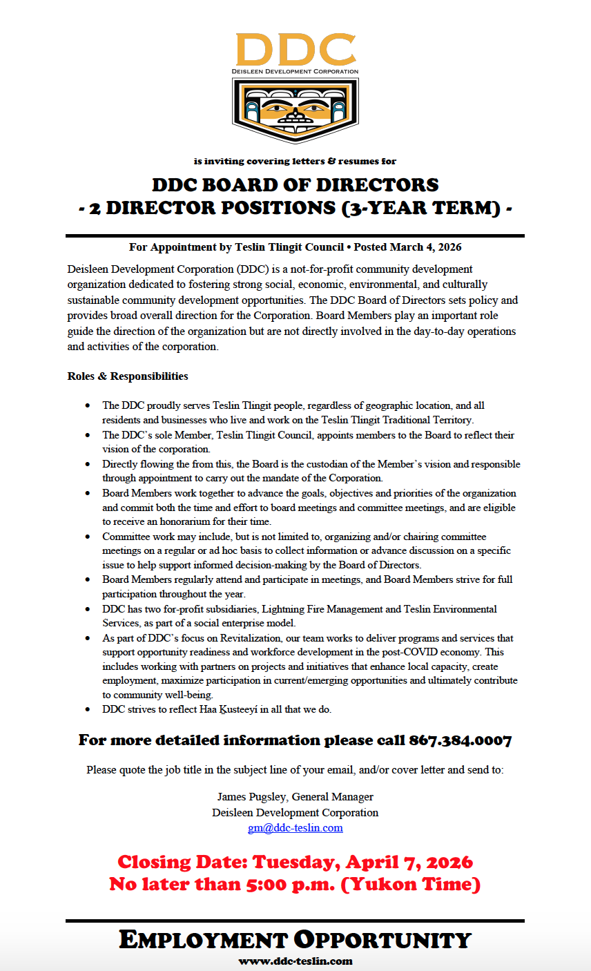 How to Apply: Send Your Resume and Cover Letter to gm@ddc-teslin.com or drop off at the DDC Office, located at 6 Fox Street, Teslin YT